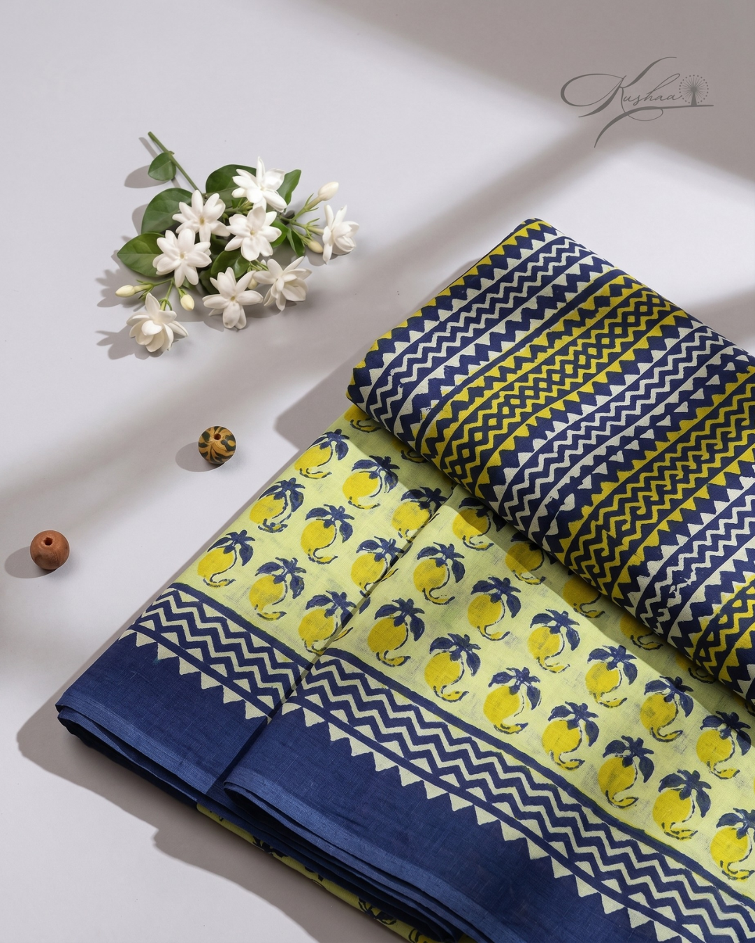 - Hand block printed cotton mul mul saree with blouse
